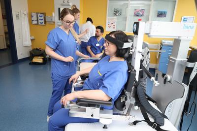 Ein großer Vorteil der Mobilisierungshilfe ist ihre Flexibilität. Auf Rollen fahrbar und mit Akku betrieben, lässt sie sich schnell von einer Person und ohne Kabelgewirr an jedes beliebige Patientenbett fahren. So steht Liana jedem Patienten für entsprechende Mobilisationsübungen zur Verfügung.