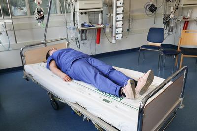 Der Clou an dem Gerät: Es kann von beiden Seiten an das Bett gefahren werden und sowohl das Aufstehen eines Patienten als auch das Einnehmen einer Sitzposition ermöglichen. Sicherheitsgurte garantieren, dass die Person in der Position bleibt.